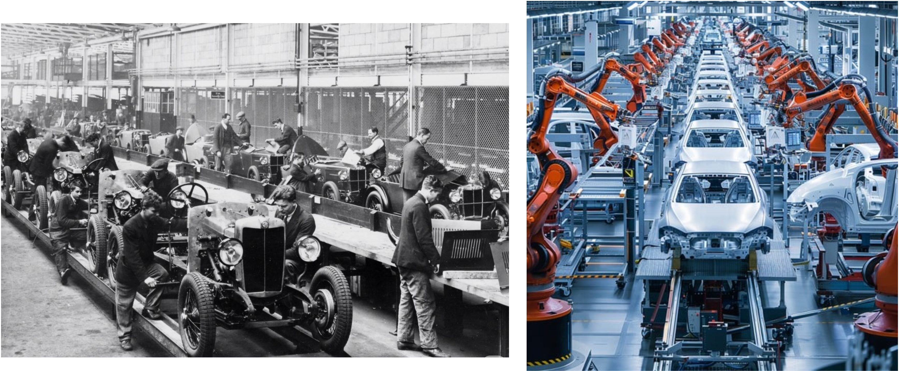 A couple of years ago I visited the BMW-MINI Production Plant, at Cowley, Oxford. This was arranged as part of our theme on ‘innovation’ for Warwick Business School’s Innovation network. The bodyshell assembly hall is 90% automated. Hundreds of huge robots, clustered in protective ‘cells’ working completely autonomously, welding, pressing and riveting panels. The robots maintain themselves, with ‘slaves’ sharpening arc welders, switching tool assemblies and calling for parts refills. The few humans we spotted were driving fork-lift trucks and feeding the robots’ insatiable appetite for materials.