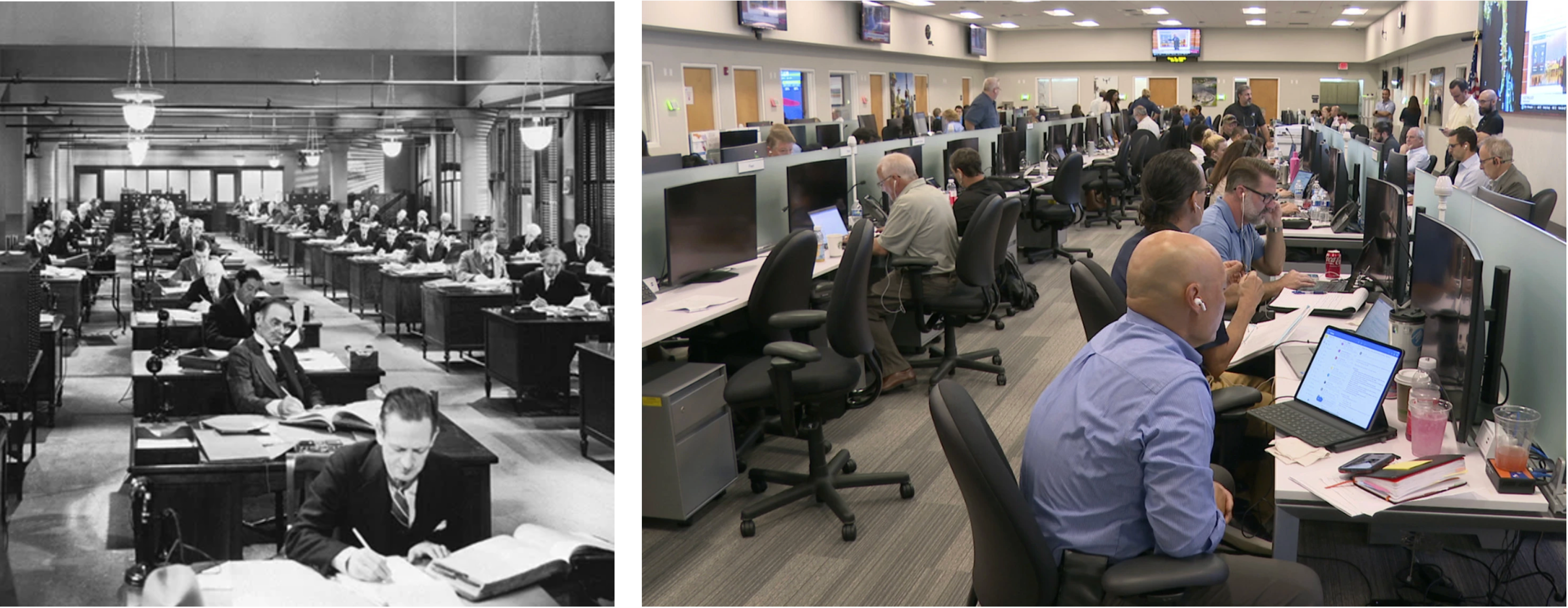 Can we say the same about office work? The left-hand picture below is a typical 1950’s office environment. What has changed when compared to the current office environment? Yes, we have computers on our desks now, but not much else has changed in almost 70 years.